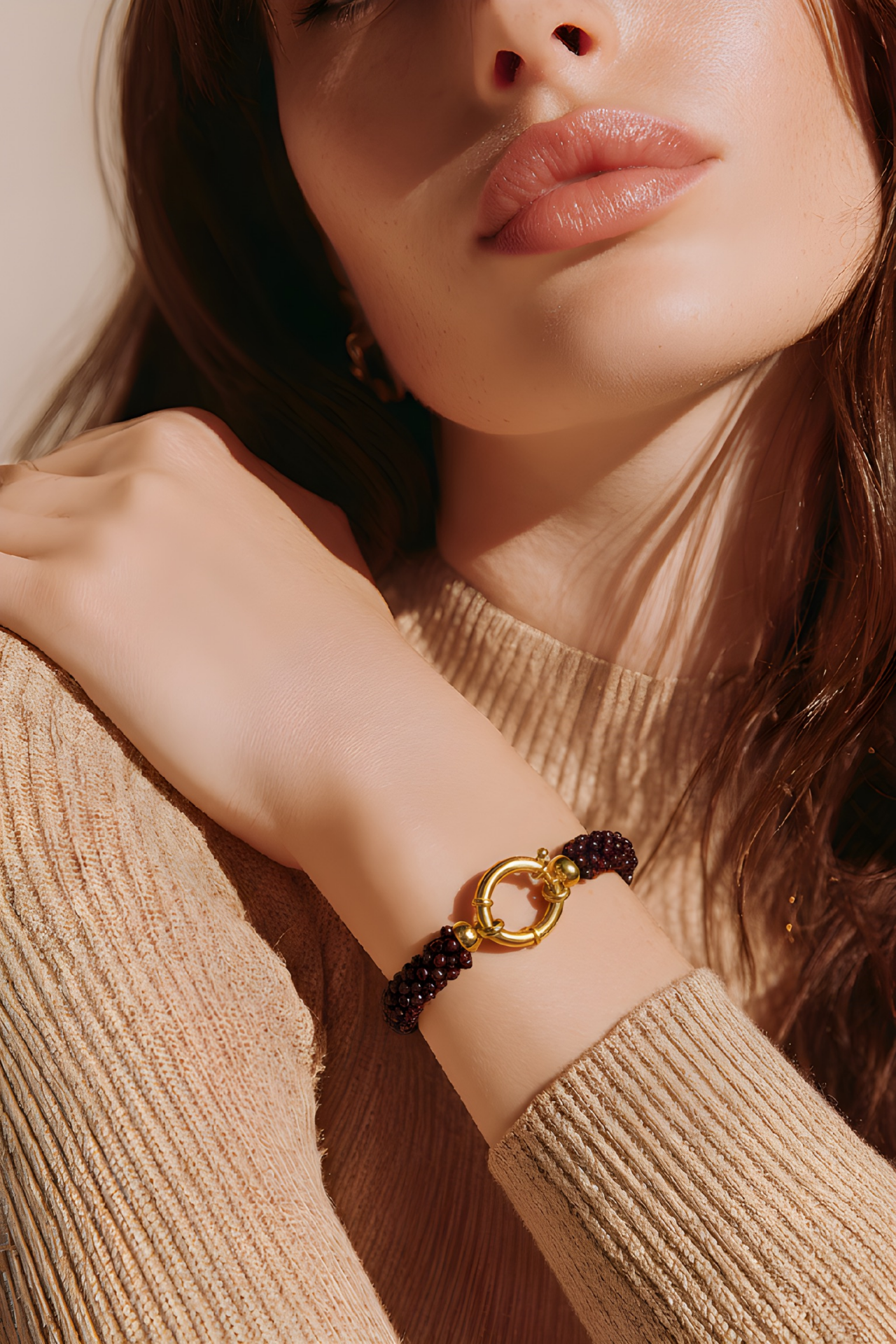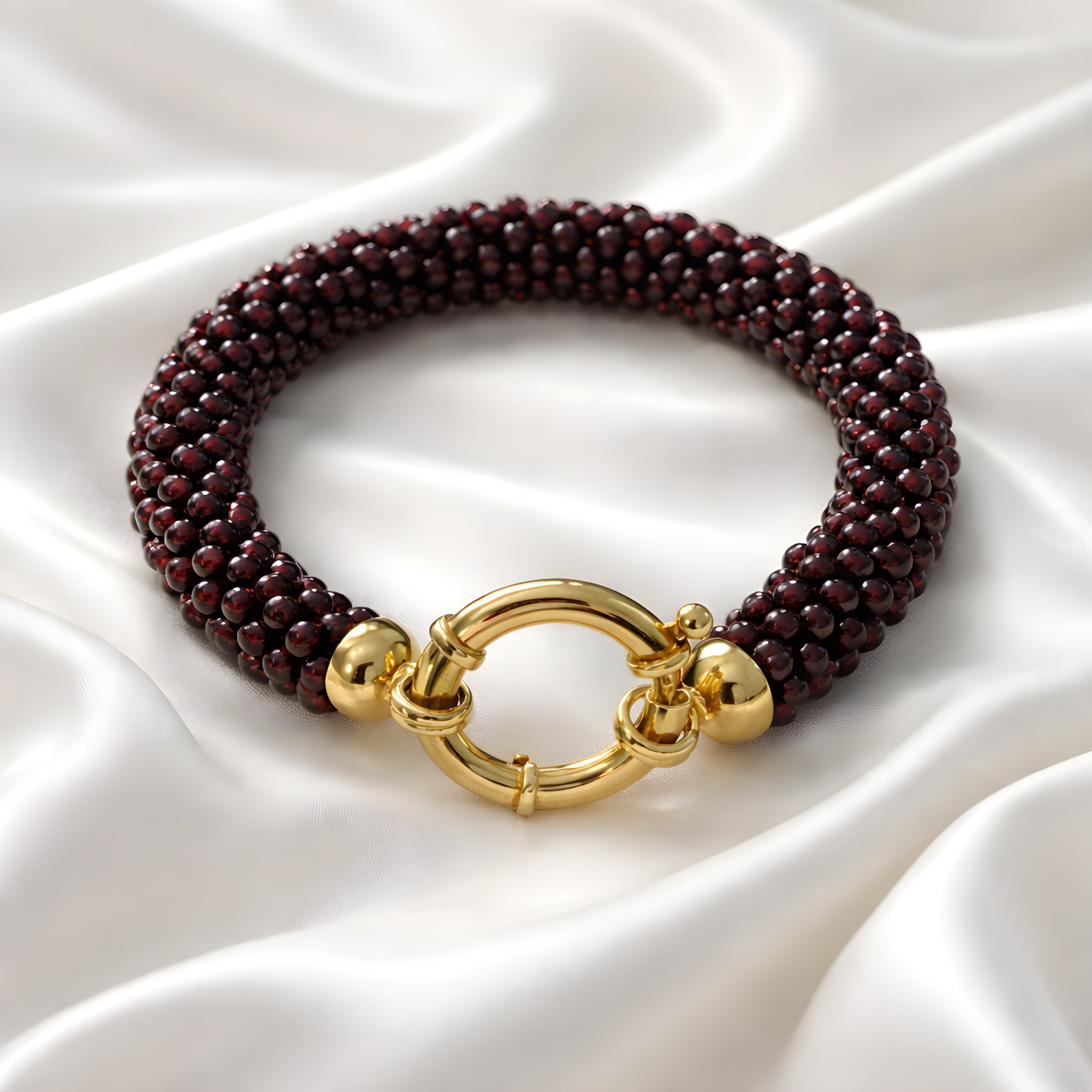 Doğal garnet taşlarının güçlü tonu ile tasarlanan bu bileklik, zamansız ve karakterli bir stil sunar. Tek başına kullanılabileceği gibi diğer bilekliklerle kombinlenerek katmanlı bir görünüm oluşturulabilir.