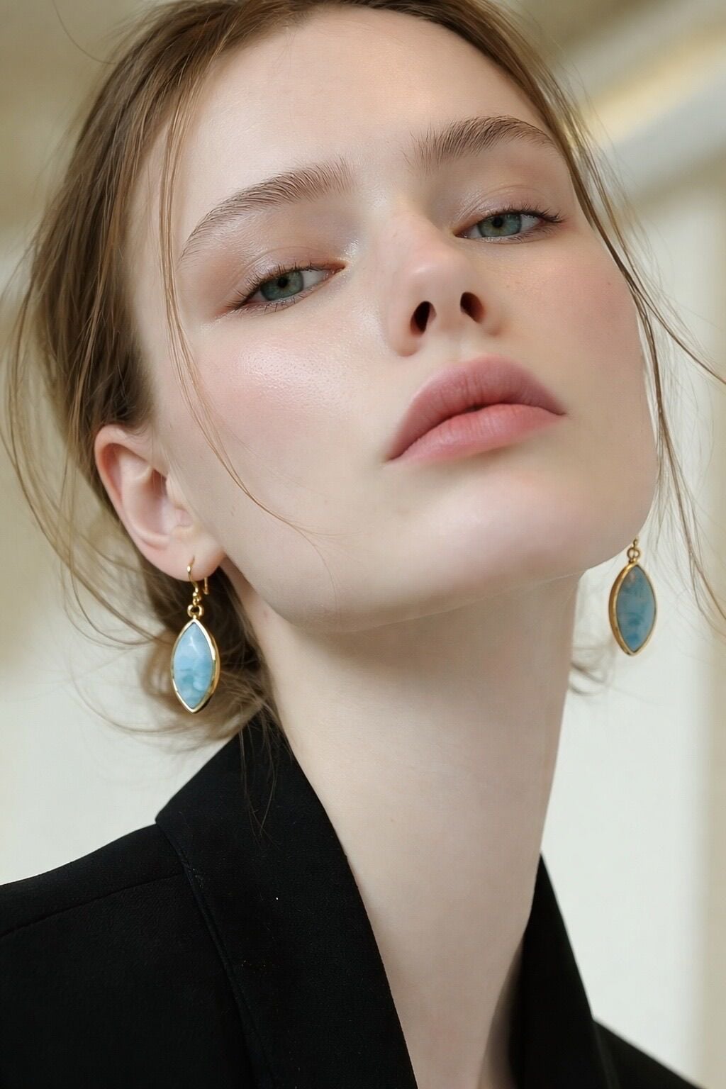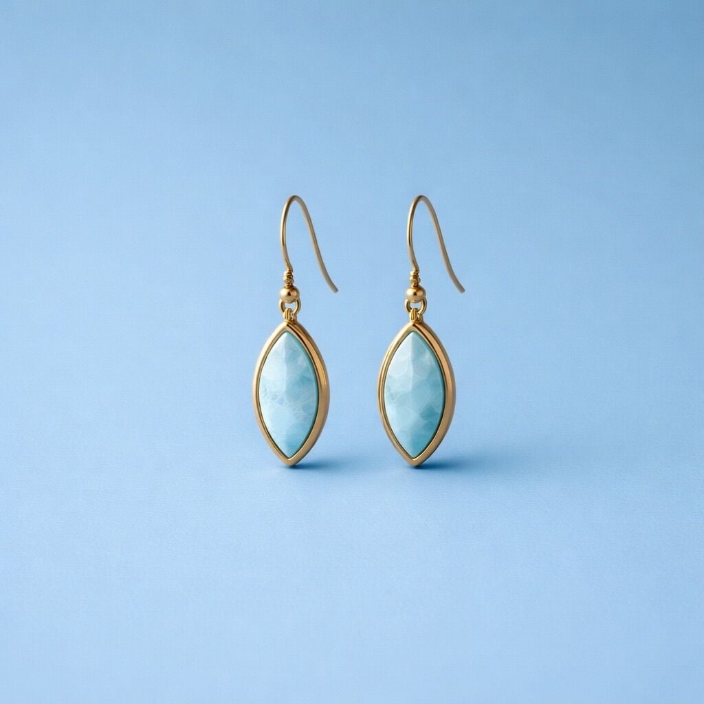 Damla kesim doğal larimar taşıyla tasarlanan bu küpe, huzurlu tonları ve zarif formuyla modern bir şıklık sunar. Hafif yapısı sayesinde gün boyu konforlu kullanım sağlar.